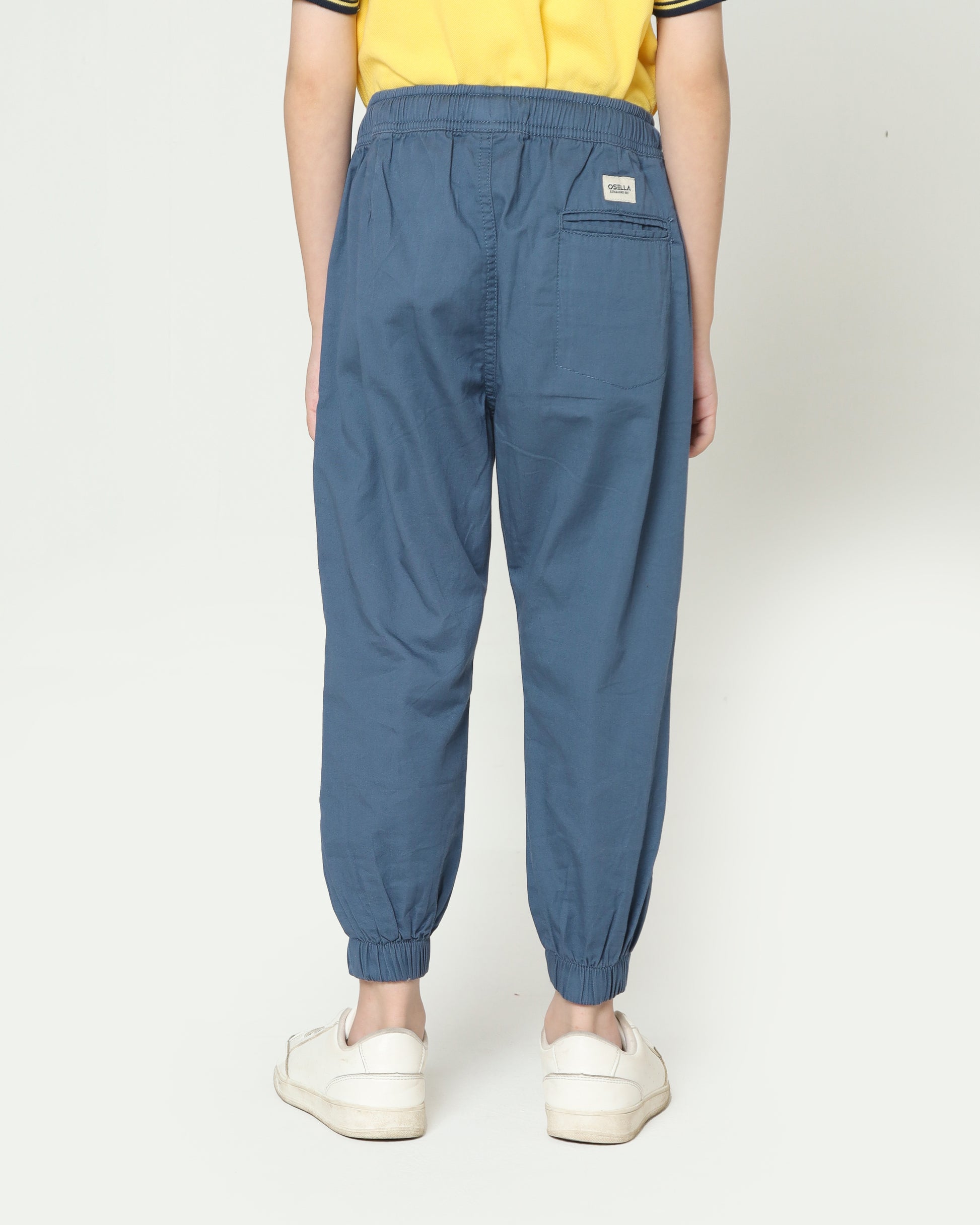 "Jogger pants with an elasticated waistband and front fancy drawstring appliqués. Front patch pockets. Elasticated hems.
