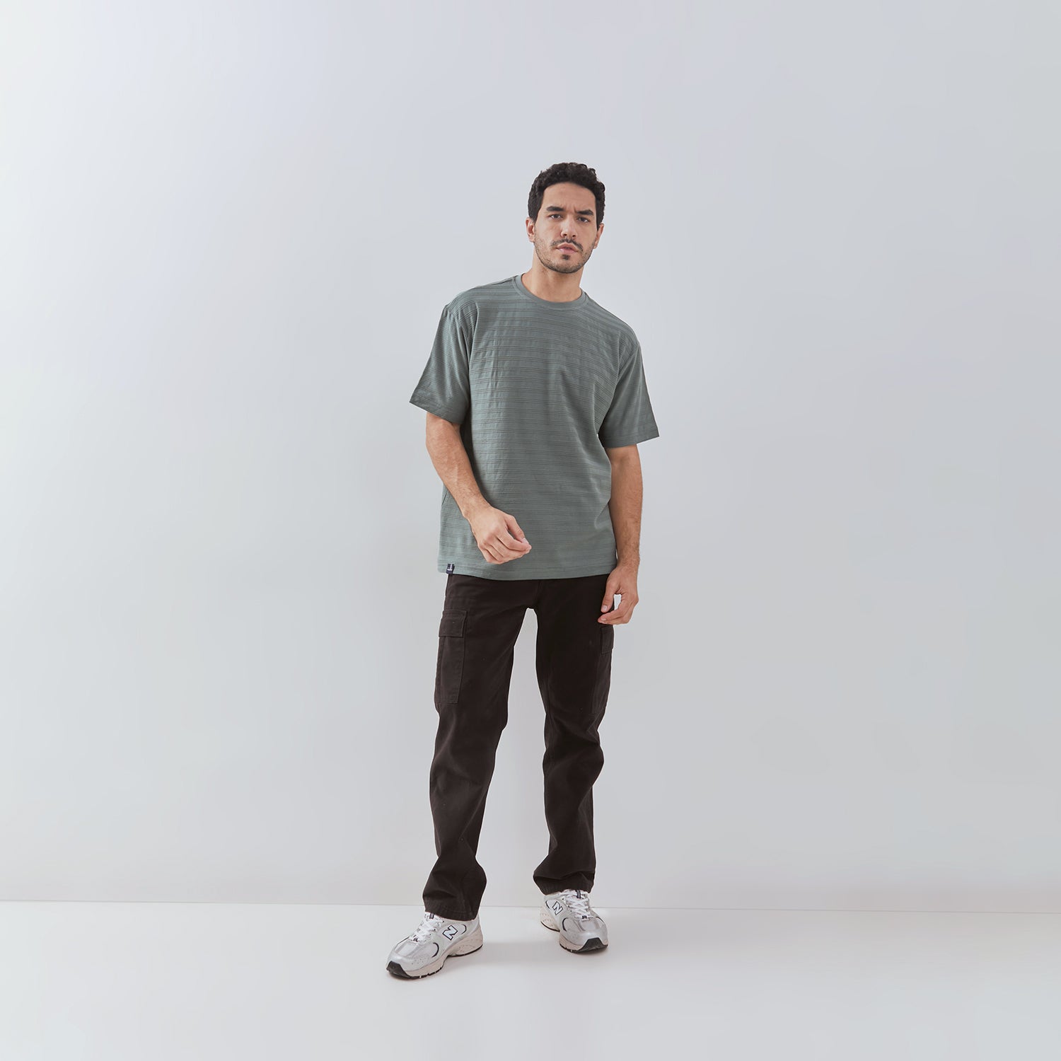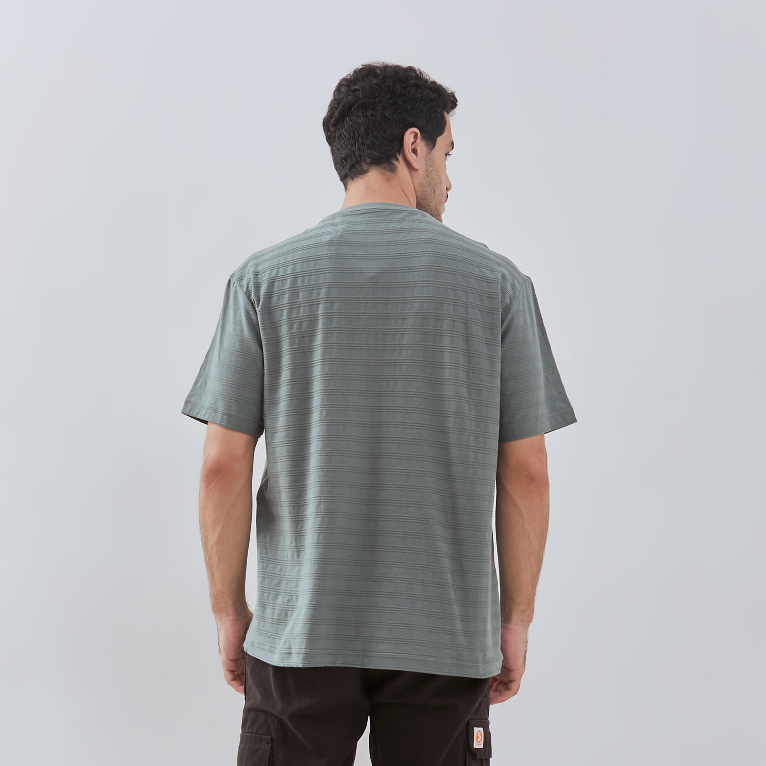 short-sleeve t-shirt featuring a round neckline, a relaxed fit, and a fancy striped fabric that adds an elevated visual and tactile appeal. Designed for versatility and comfort, this shirt combines casual ease with a sophisticated twist, thanks to its distinctive striped material and loose silhouette. Whether worn as a standalone piece or layered, this t-shirt delivers effortless style and comfort.