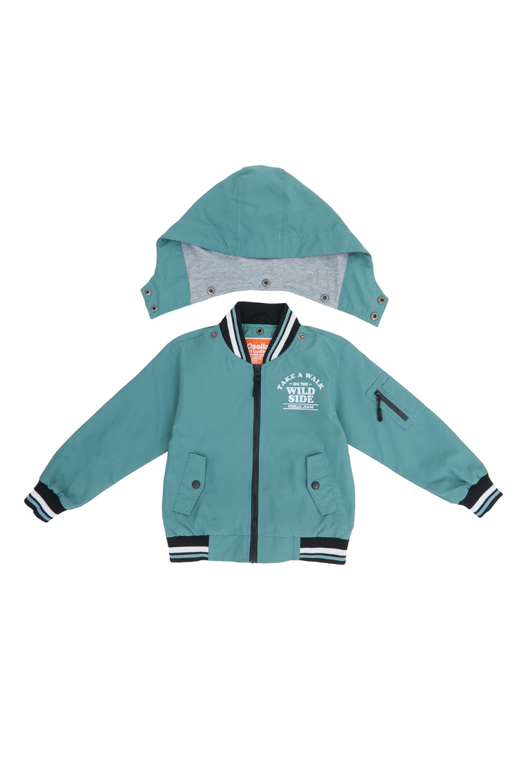 "Wasabi Green Bomber Jacket for boys, crafted from sturdy parachute material. This jacket features a removable hoodie for versatility and ribbed detailing for added style. Perfect for outdoor adventures, it combines functionality with fashion effortlessly.