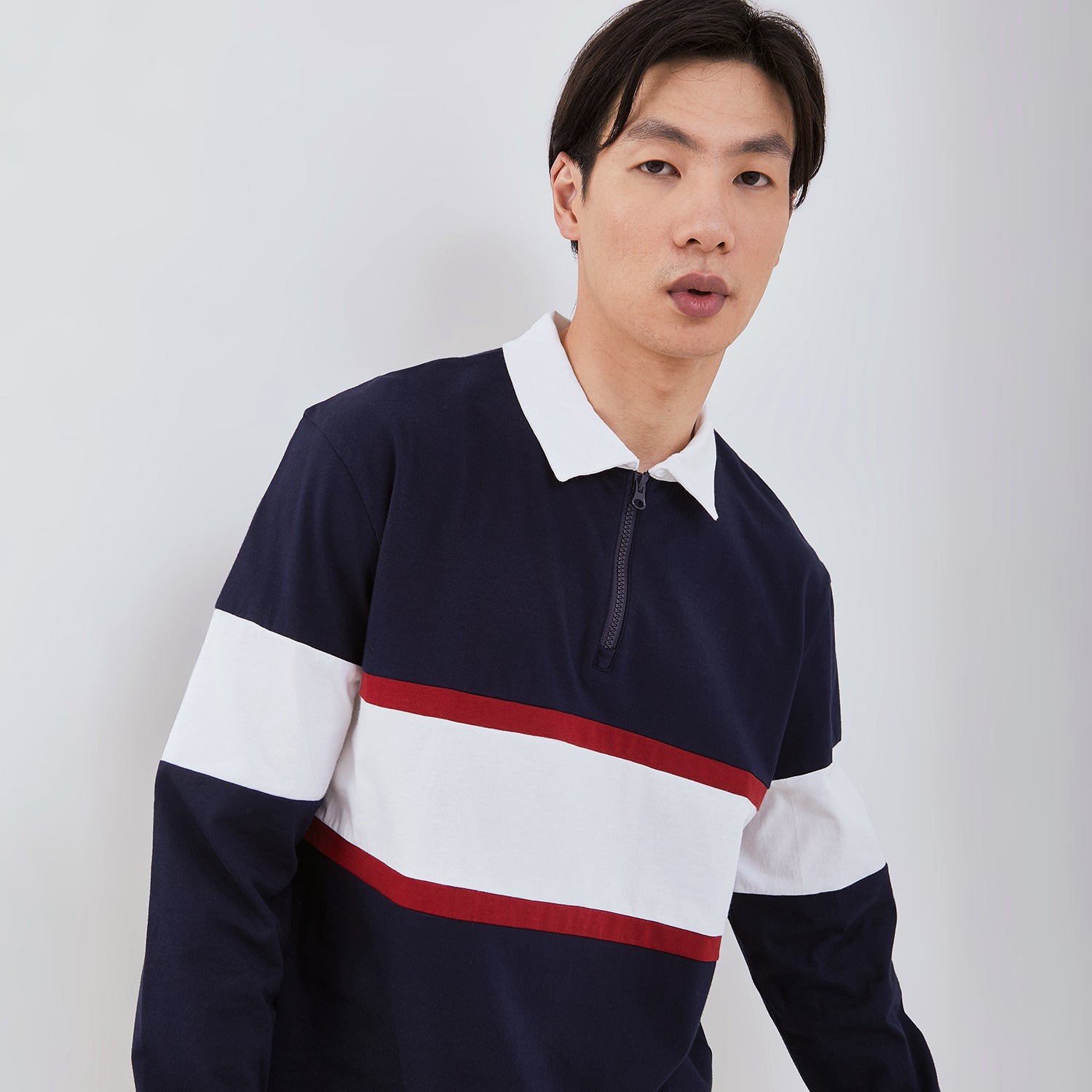 "Long-sleeved polo shirt for men featuring a striped pattern in copen blue and