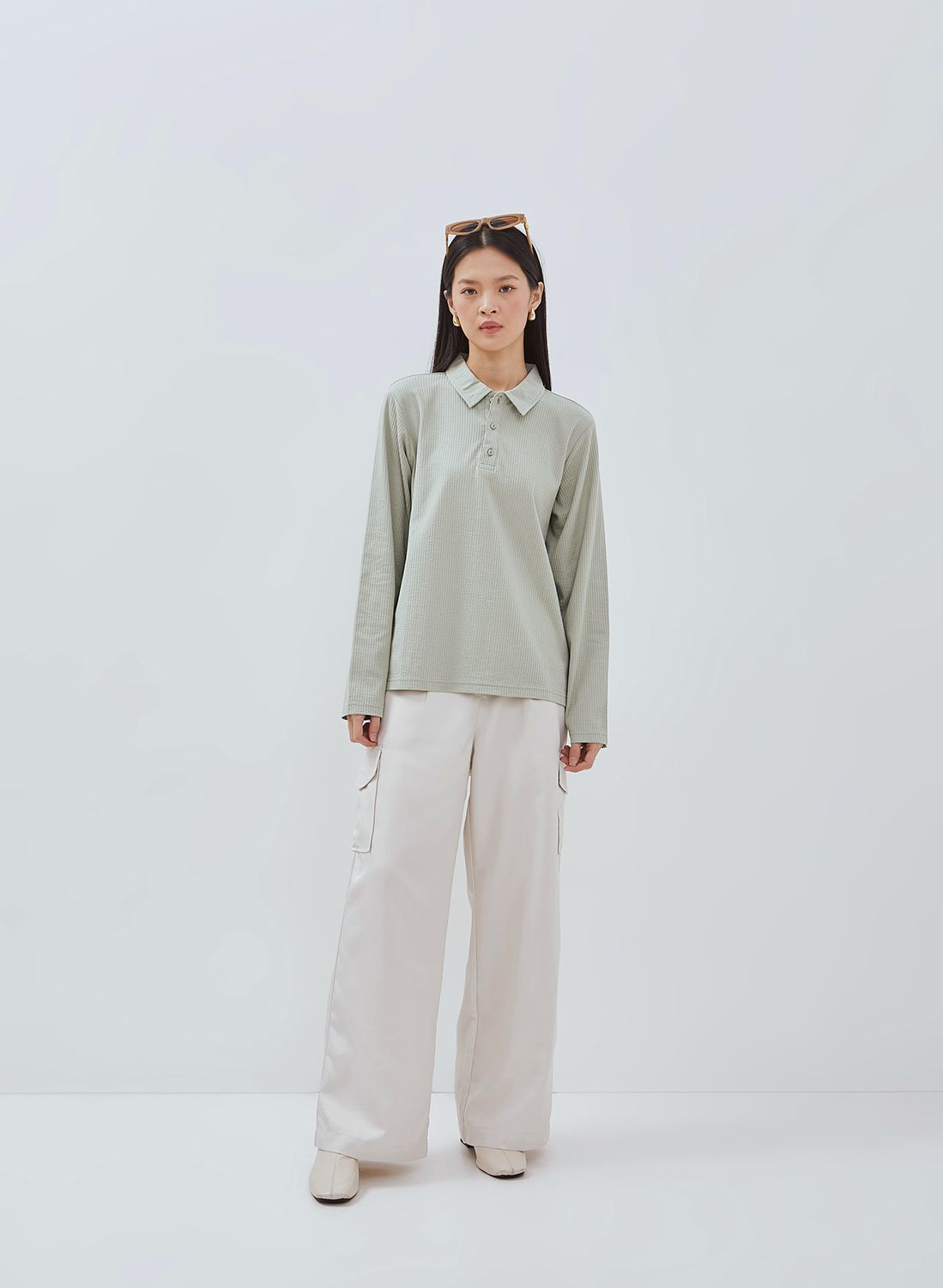 Long sleeve fancy knit fabric polo. Featuring lapel collar and front button fastening a stylish long-sleeve polo made from fancy knit fabric. The design includes a lapel collar and a front button fastening, giving it a sophisticated yet comfortable look. This type of polo could be worn in both casual and semi-formal settings, pairing well with trousers or skirts for a polished appearance.