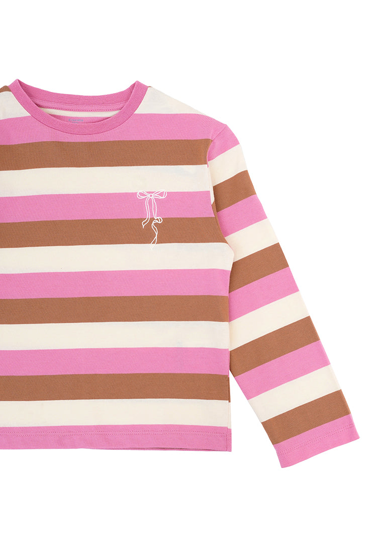 Bring a pop of sweetness to your wardrobe with our tee. Featuring bold horizontal stripes in soft pink, chocolate, and ivory. This top is the perfect blend of fun and cozy. Crafted from breathable single jersey, it feels gentle on the skin while keeping you comfy all day. The classic crew neckline and stright cut-sleeves make it easy to style, pair it with jeans, skirt or shorts for an effortlessly cool look.