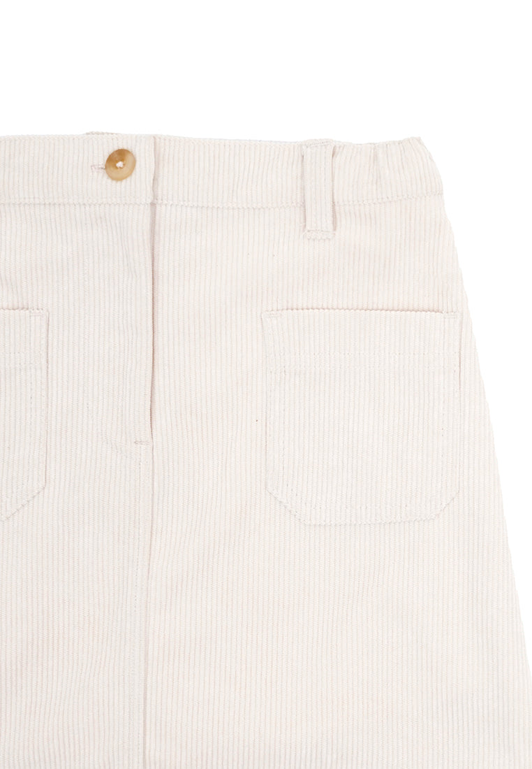 This girls' corduroy skort in a soft ivory color. Made from fine-wale corduroy fabric, it offers a subtle texture and cozy feel. The skirt features a stright-cut silhouette with comfortable adjustable waistband at the back, ensuring an easy fit. Functional details include belt loops, a front button closure with marble pattern, and two front patch touch. This piece is ideal for pairing with cozy sweaters or tucked-in tops for classic, timeless look.