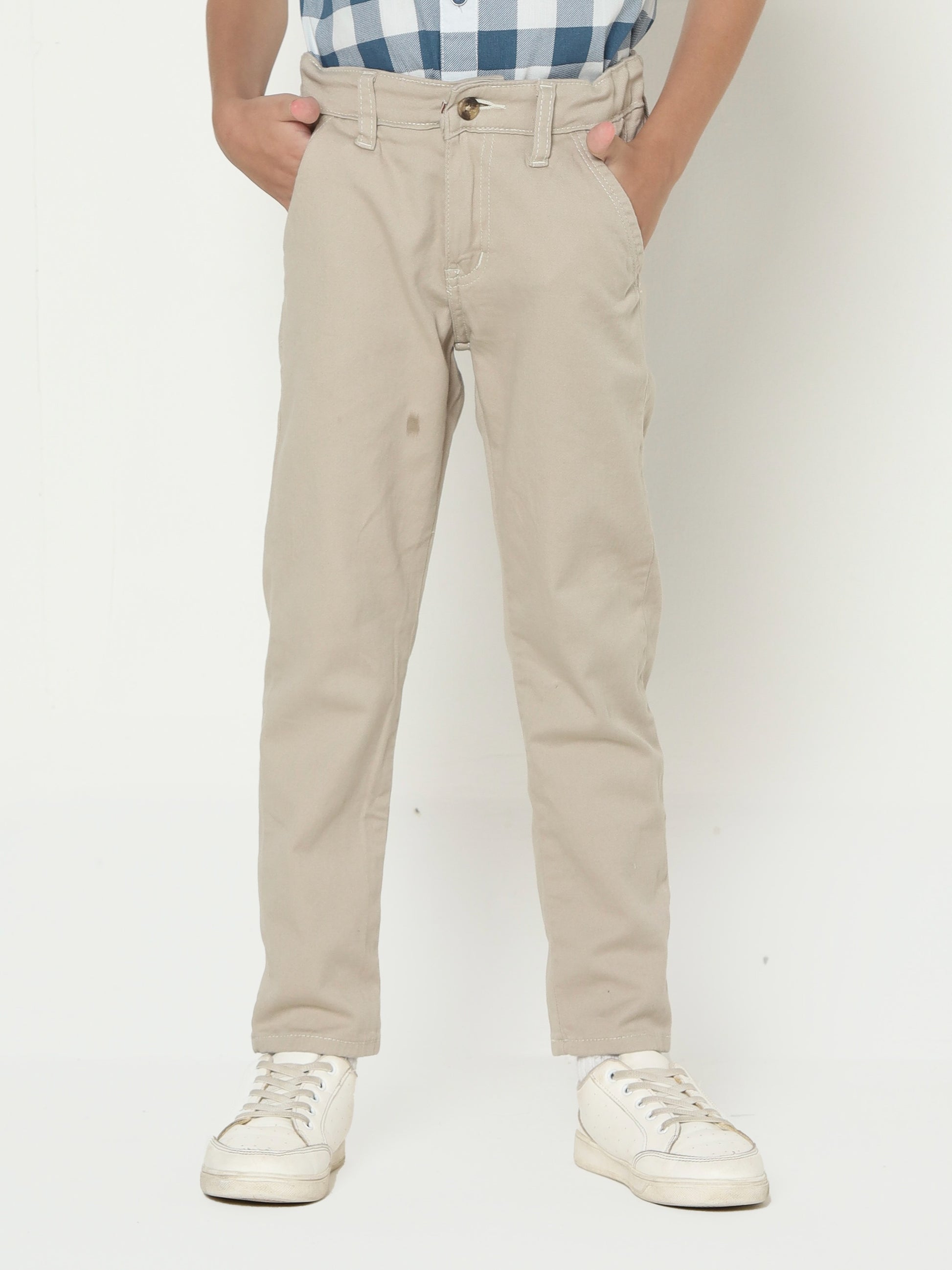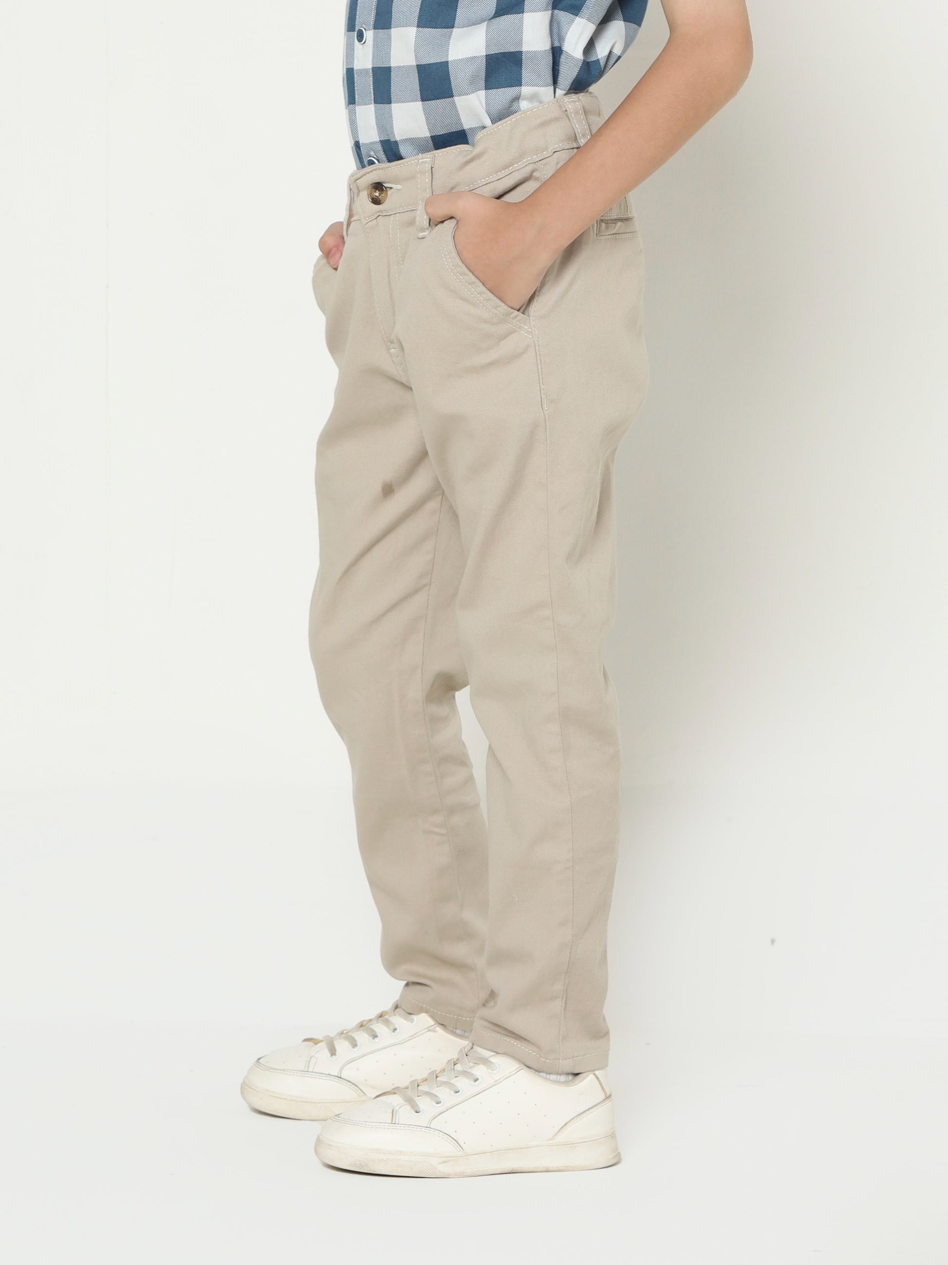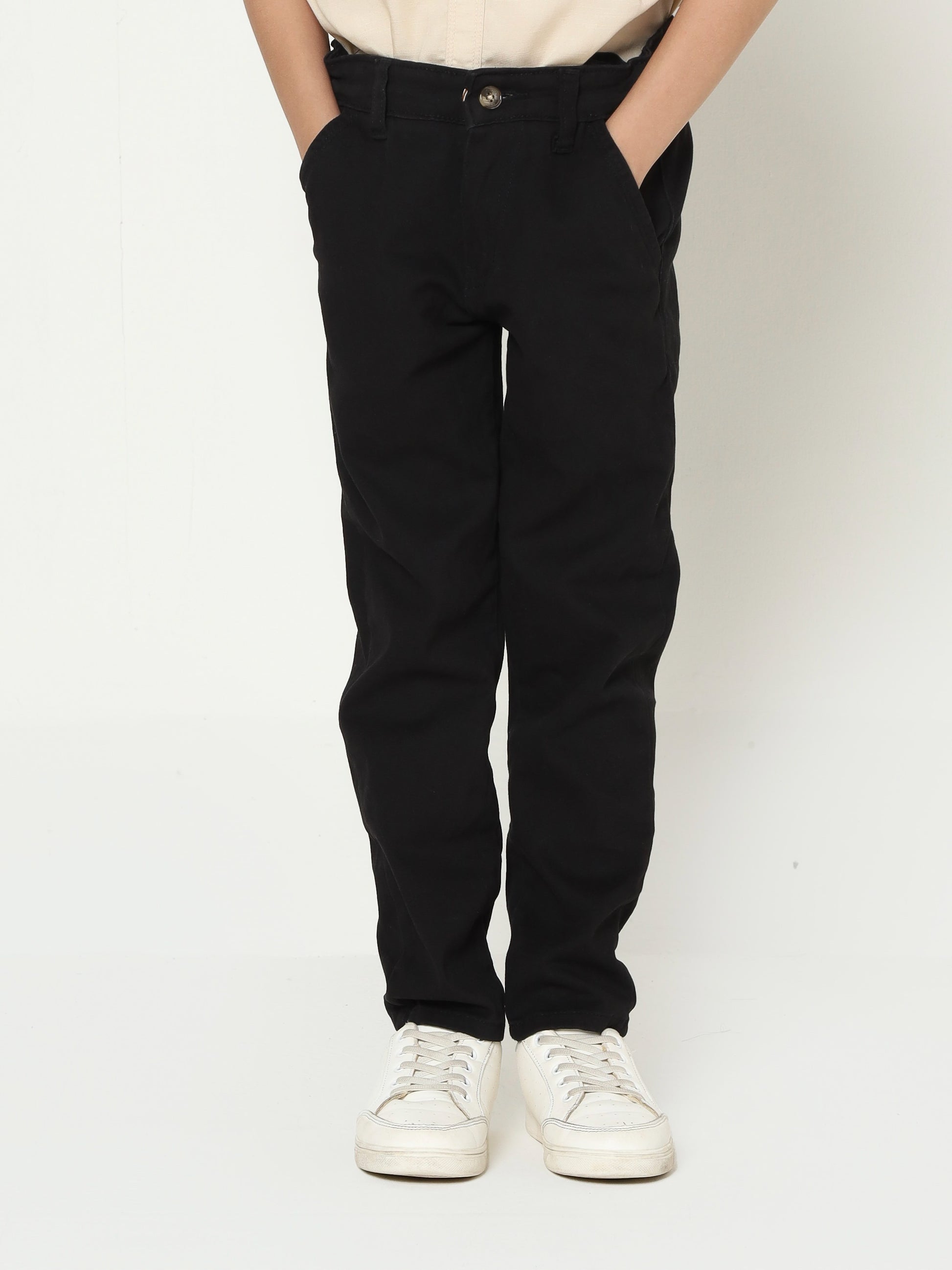 These boys' pants are crafted from comfortable twill stretch fabric that offers flexibility and ease of movement for active kids. Designed with functional front pockets, they combine practicality with a clean, everyday look. The elastic waistband with a front button closure ensures a secure and comfortable fit. Perfect for formal or casual outings, these pants deliver all day comfort with a stylish twist.