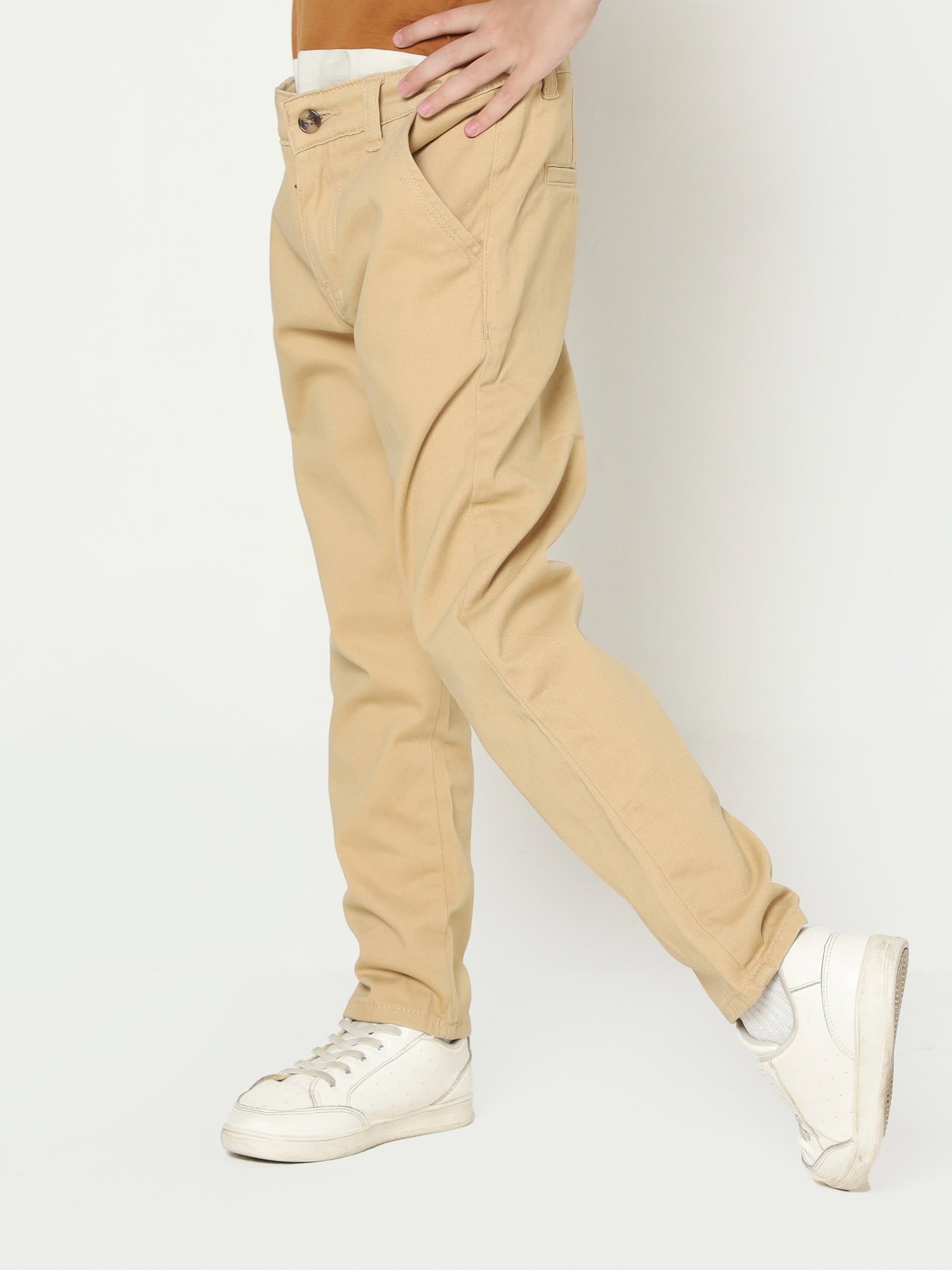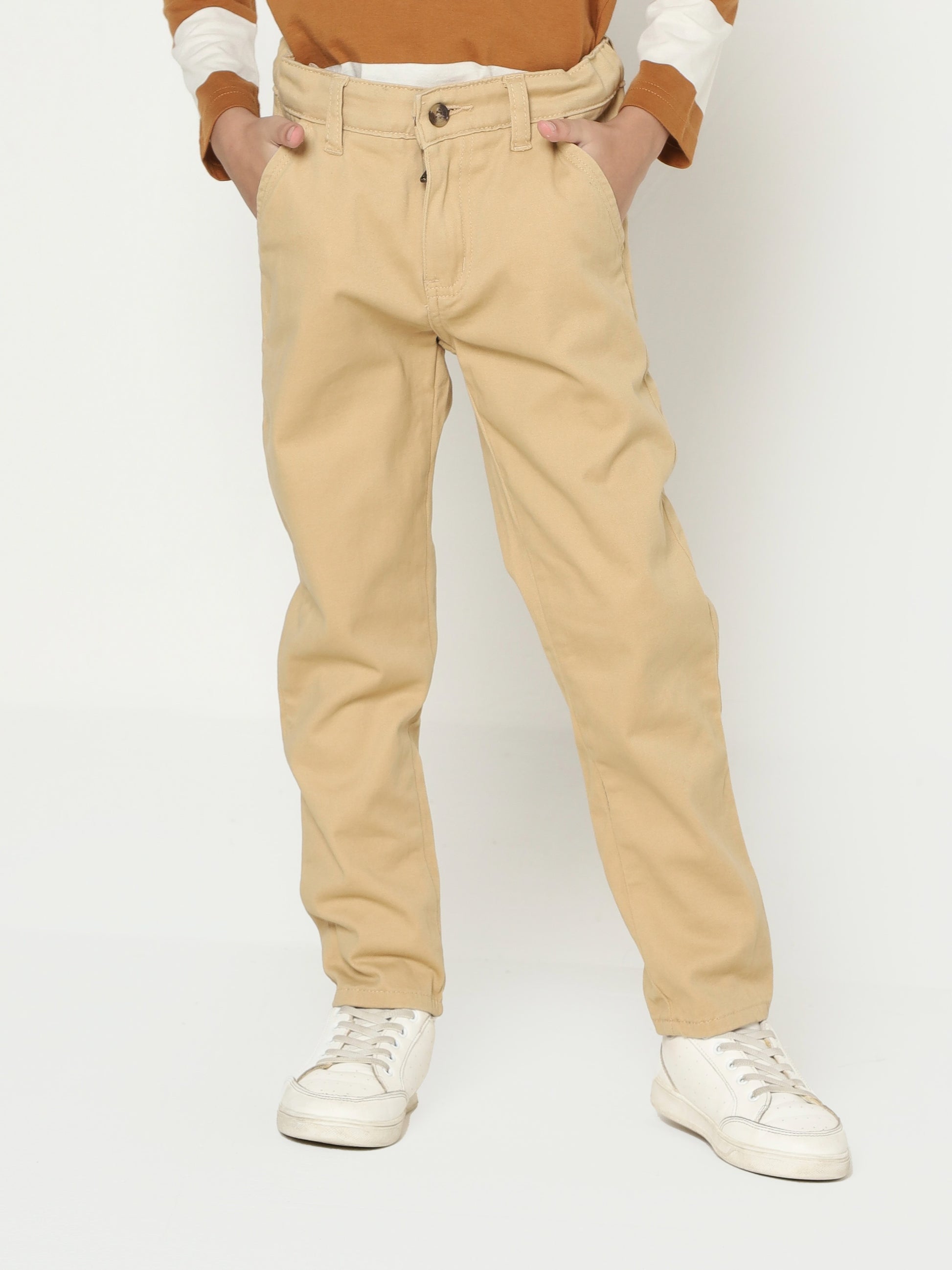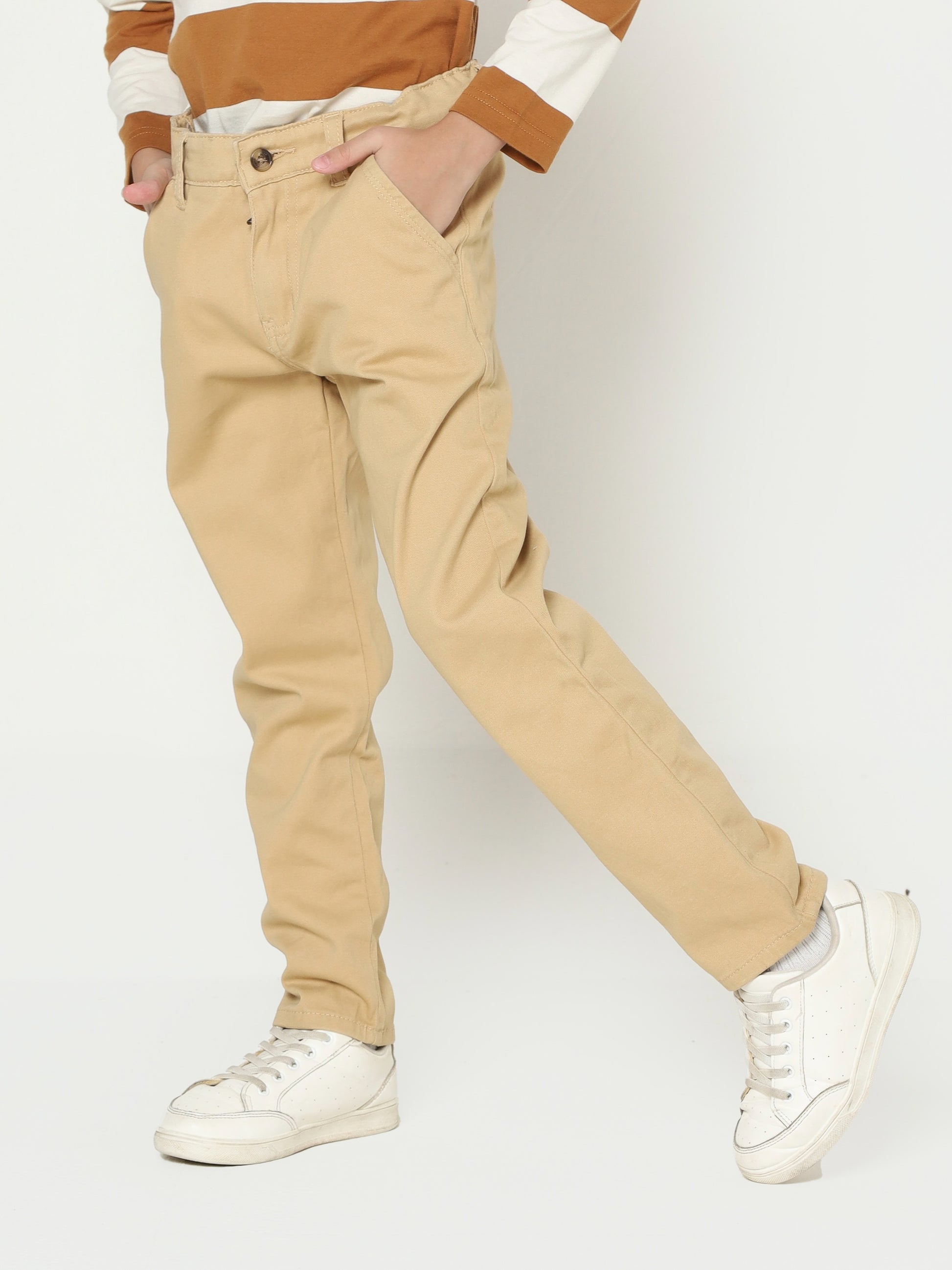 These boys' pants are crafted from comfortable twill stretch fabric that offers flexibility and ease of movement for active kids. Designed with functional front pockets, they combine practicality with a clean, everyday look. The elastic waistband with a front button closure ensures a secure and comfortable fit. Perfect for formal or casual outings, these pants deliver all day comfort with a stylish twist.