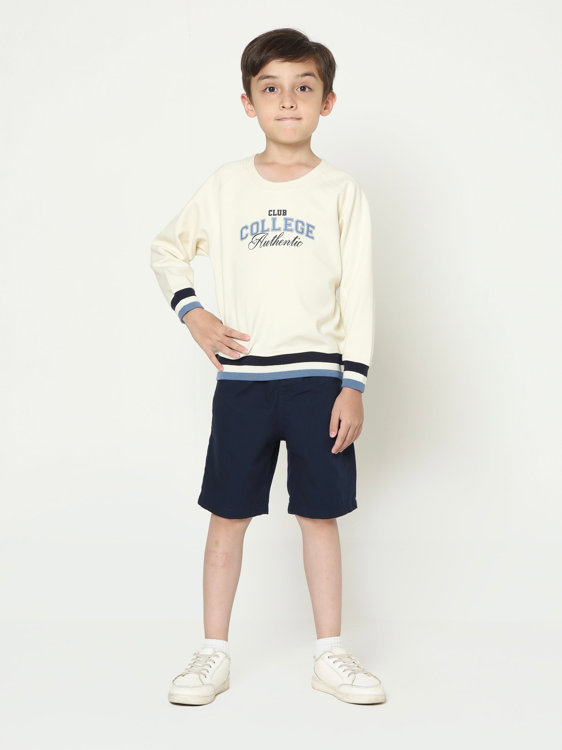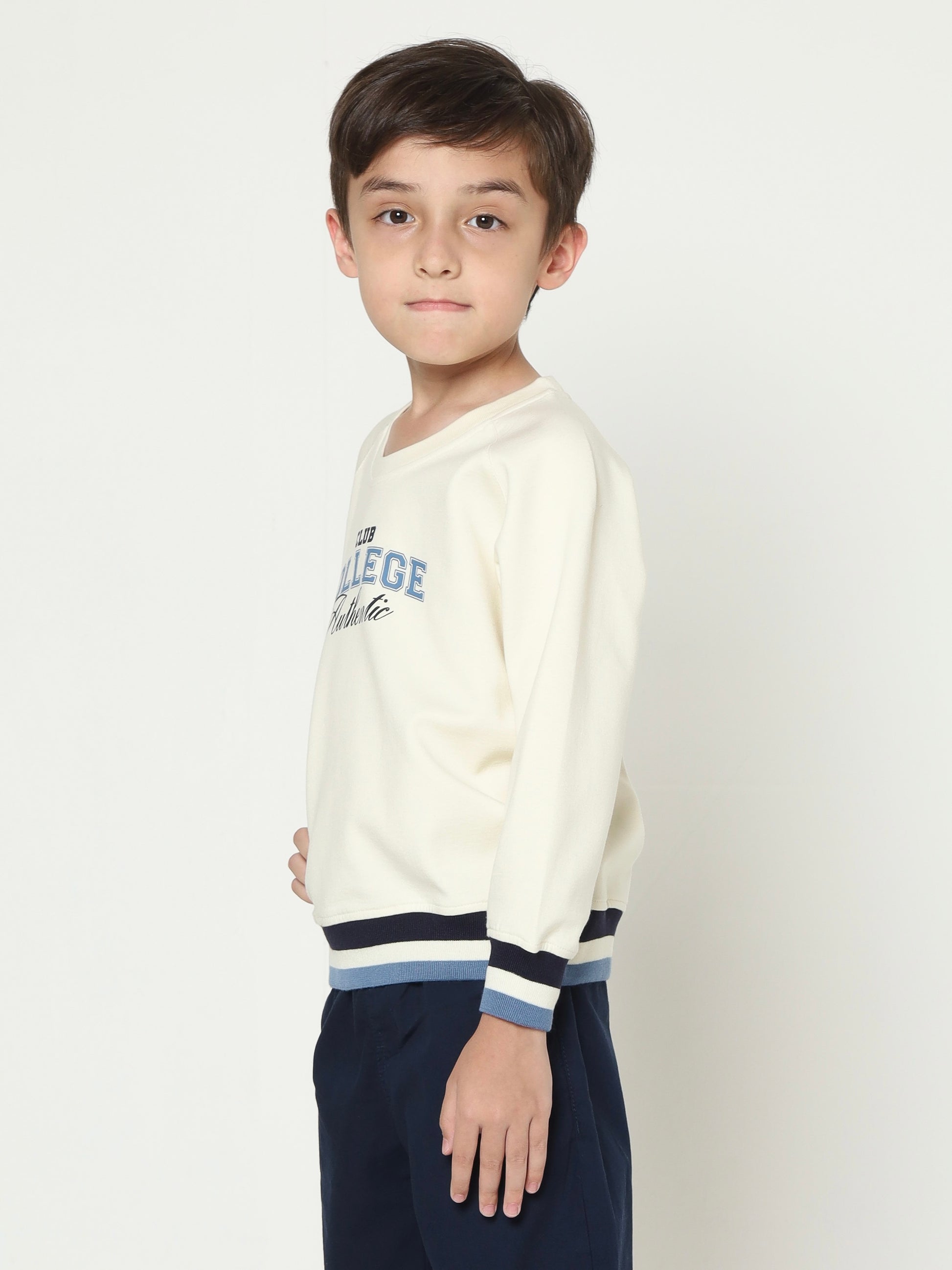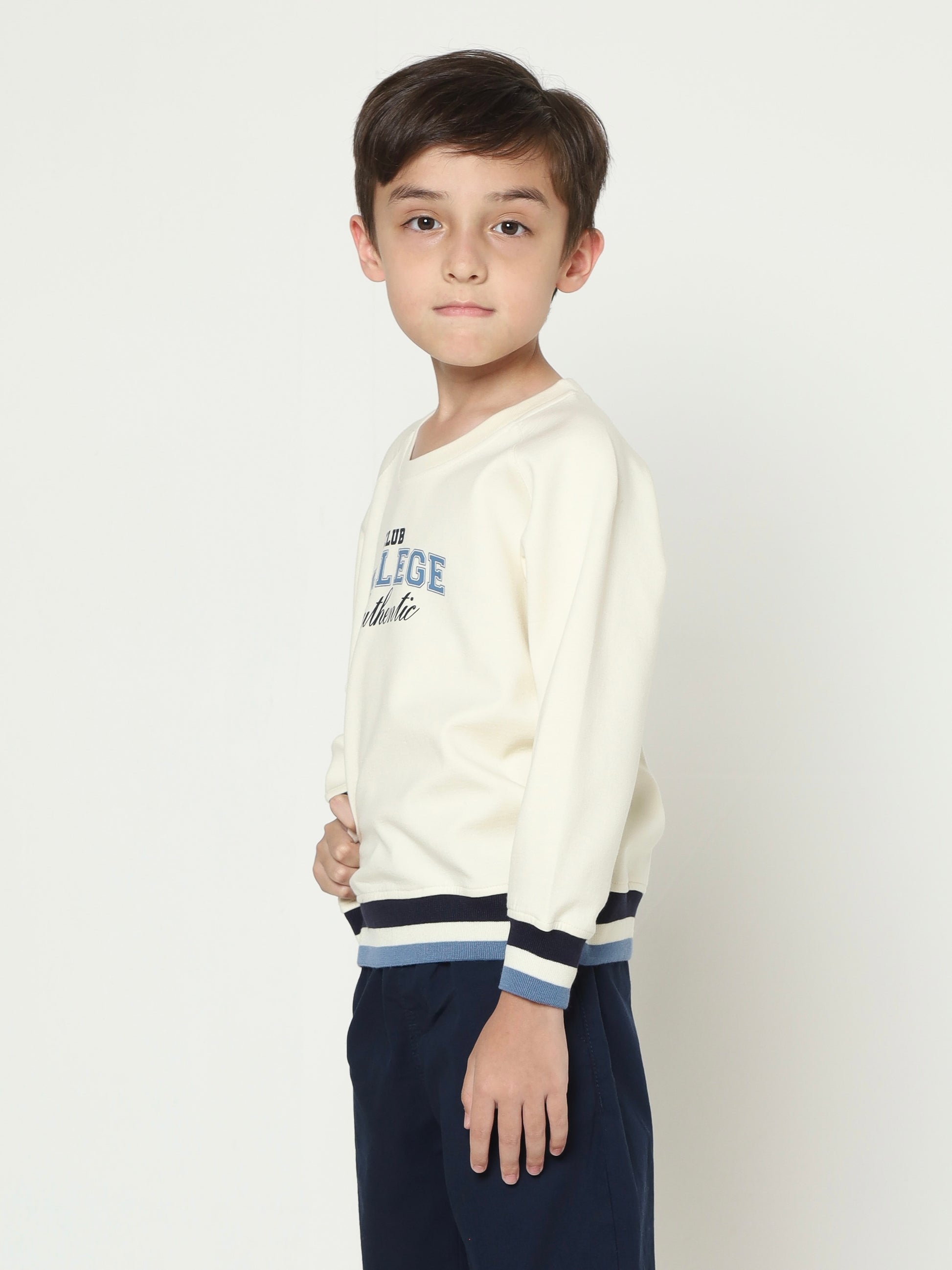 This boys' sweatshirt is made from Danball fabric, a double knit material that offers a perfect balance of structure and softness. Featuring bold collegiate inspired lettering, raglan sleeves, and striped ribbed cuffs, it blends sporty vibes with timeless style. Ideal for layering or wearing solo, it keeps boys warm and stylish through every season.